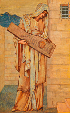 A heavily draped female figure, her head covered, stands in an enclosed space beside a building of stone construction and with a single barred window. A woman stands in the foreground holding a dulcimer the strings of which she appears to pluck. The drawing’s title – The Answering String – seems to imply that she has found a way to communicate with an unseen person who is held captive in a cell, by striking a note on her instrument and awaiting the reply. More on this painting