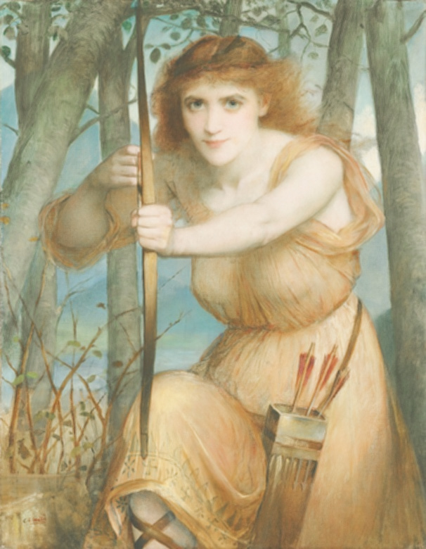 Within this work, Hallé demonstrates his interest in classical themes by depicting Diana, the Roman goddess of the hunt and nature. Though tackling a mythological subject, Hallé stylistically expresses his alignment with the Pre-Raphaelites through Diana’s flowing auburn hair, pale porcelain skin and green eyes. Here the huntress turns on the viewer, gazing coolly out of the picture plane, with her bow and arrow trained on the spectator. This action is perhaps a subversion of the famous tale of Diana and Actæon as recounted in Ovid’s Metamorphoses. In the story, while out on a hunt, Actæon stumbles upon Diana bathing with her nymphs. Enraged at having been seen in such a state of undress, Diana turns the hapless hunter into a deer, whereupon he is promptly hunted by his own hounds as punishment for his indiscretion. In the present lot, Diana embodies strong and vengeful womanhood, as she is now placed in the position of power and confrontation. This subject was perhaps selected by Hallé due to the theme of female liberation, which was then at the fore in contemporary society, owing to the gathering momentum of the suffragette movement. More on this painting