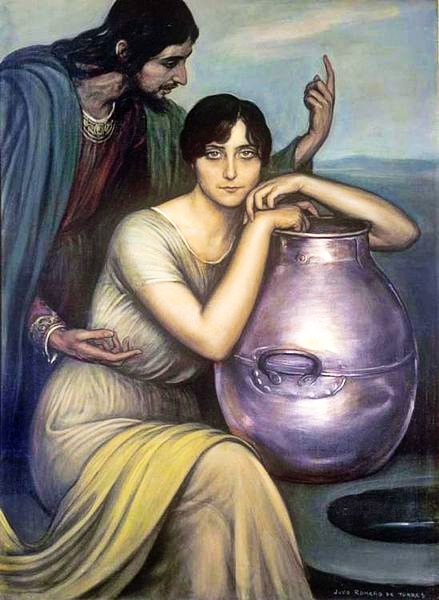 A Samaritan woman came to draw water, and Jesus said to her, “Give me a drink.” The Samaritan woman said to him, “How is it that you, a Jew, ask a drink of me, a woman of Samaria?” Jesus answered her, “If you knew the gift of God, and who it is that is saying to you, ‘Give me a drink’, you would have asked him, and he would have given you living water.” The woman said to him, “Sir, you have no bucket, and the well is deep. Where do you get that living water? Are you greater than our ancestor Jacob, who gave us the well, and with his sons and his flocks drank from it?” Jesus said to her, “Everyone who drinks of this water will be thirsty again, but those who drink of the water that I will give them will never be thirsty. The water that I will give will become in them a spring of water gushing up to eternal life.” The woman said to him, “Sir, give me this water, so that I may never be thirsty or have to keep coming here to draw water.” More on the Samaritan womanJulio Romero de Torres (9 November 1874 – 10 May 1930) began to paint under the instruction of his father, the well-known Andalucian artist and teacher, Rafael Romero Barros. Whilst growing up and studying art, he was exposed to the exciting emergence of Realism, Impressionism and Symbolism, giving rise to a unique style in which he combined the Realist traditions of Gustave Courbet and Mariano Fortuny, the photographic portraiture of Federico de Madrazo and the Impressionism of Aureliano de Beruete, Dario de Regoyos and Joaquín Sorolla y Bastida. His early career developed well and he was rewarded with a mention of honour at the 1895 National Exhibition went on to win third class medals in 1899 and 1904.