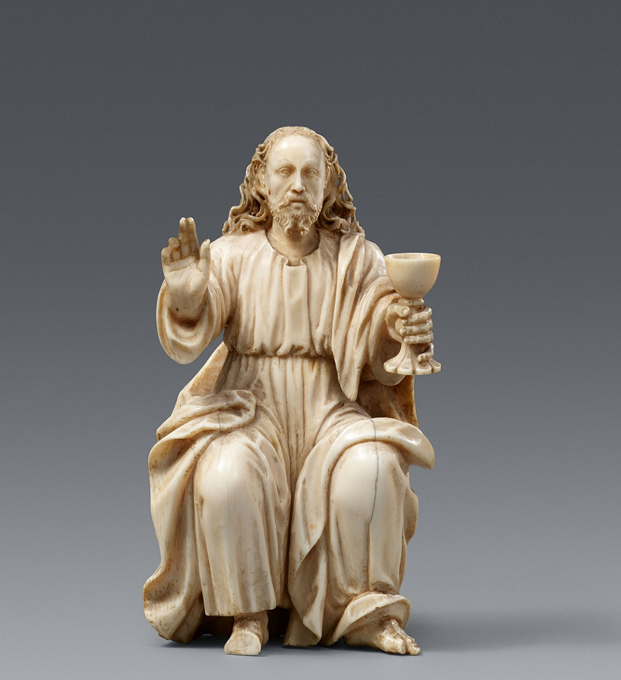 Depiction of Christ enthroned and looking towards the viewer; His right hand raised in blessing, He also holds a chalice in His outstretched left hand, referring to the Eucharist. The high-quality ivory carving, designed for a frontal viewpoint, is particularly notable for the detailed observation of the folds of the long robe, which is surpassed only by the delicacy of the physiognomy and the locks of hair. More on this carving