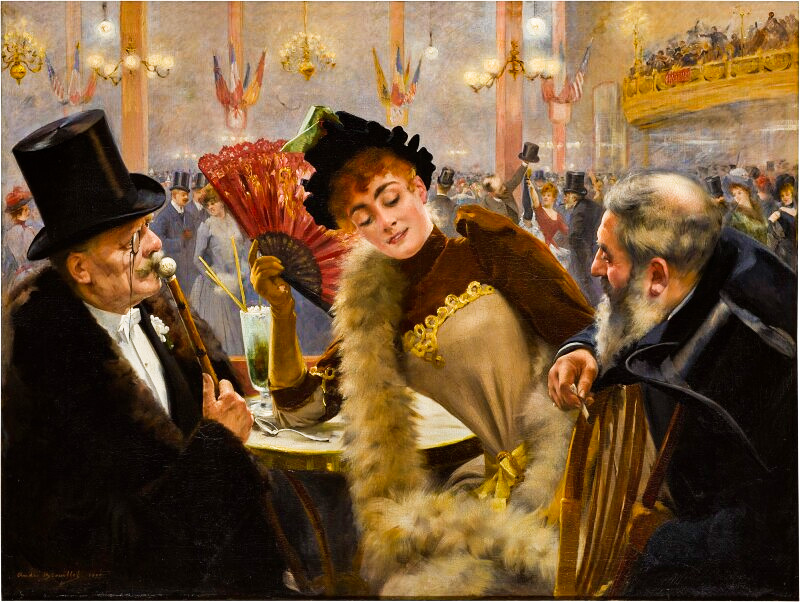 Sold for USD 96,000 in Oct 2005In this painting, Brouillet restages the Old Testament narrative of Susannah and the Elders at the Moulin Rouge and populates the scene with contemporary characters. Unlike the biblical Susannah, besieged by two leering older men while bathing outdoors, this stylishly attired and self-possessed Suzanne is propositioned by two elegantly dressed gentlemen in the midst of a bustling bar. In this modern iteration, Suzanne appears to wield the power, unlike her Old Testament counterpart. The popular Parisian café-concert is bustling with activity: one dancer, to Suzanne’s right, lifts her leg up toward a man’s top hat, an acrobatic trick reminiscent of the famous can-can performed by the Moulin Rouge’s dancers. More on this painting