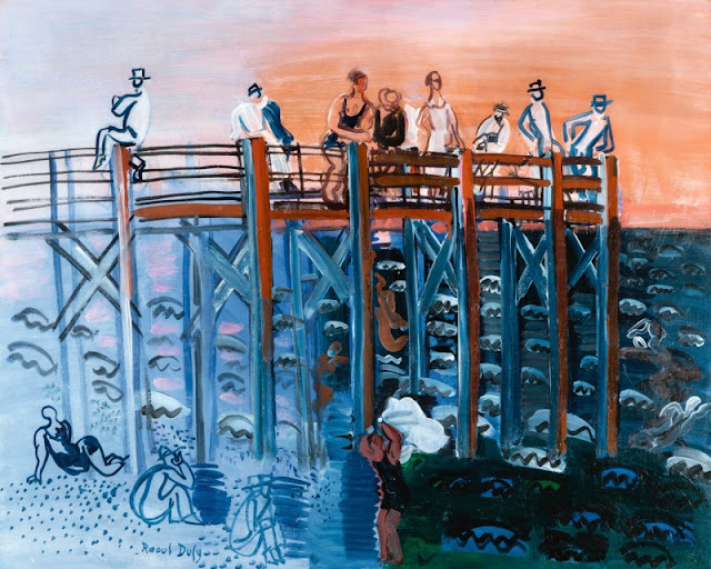 Raoul Dufy was born in Le Havre, a city that remained a constant source of inspiration for his painting. While he continued to paint the harbour and its activity between 1900 and 1904, Dufy also began showing interest in seaside recreation as early as 1901. The busy pier with people strolling out to the sea remained a focus of his work until the 1920s. While the early versions on this subject are marked by lively strokes similar to certain works by Boudin, Dufy soon turned his attention to the geometry of wood constructions, the shapes of which could be conveyed by variations in colour. More on this painting