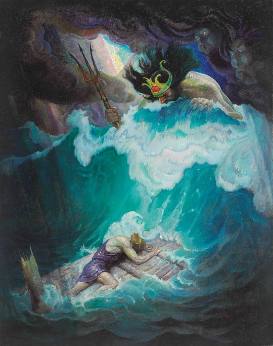 A vivid jewel tone palette covers much of the canvas, with striking turquoises, emeralds and violets applied in brushwork that suggests movement in both the intense swelling of the sea and storm clouds swarming above. The ominous dark clouds are a stark contrast to the white foam of the wave that looms over Odysseus. The composition echoes Pyle’s teachings as well; Odysseus, the main protagonist in the story, is in the foreground as he clings to the raft with its broken mast jutting out from the water, while Neptune is positioned at a diagonal that continues from Odysseus through the wave to the upper right. The result of Wyeth’s adept work in The Raft of Odysseus (Neptune Battles with Odysseus) is a powerful image that brings to life for readers the mythical drama of this significant piece of literature. More on this painting