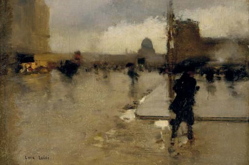 A boulevard in Paris on a rainy day, the Pantheon beyond