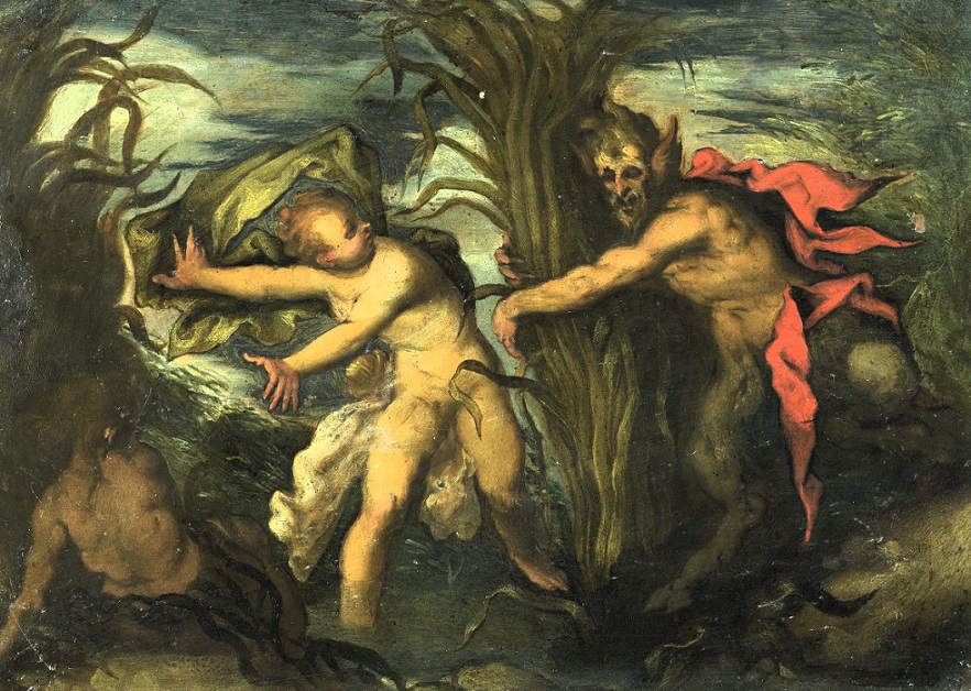 In classical Greek mythology, Syrinx was a nymph and a follower of Artemis, known for her chastity. Pursued by the amorous god Pan, she ran to a river’s edge and asked for assistance from the river nymphs. In answer, she was transformed into hollow water reeds that made a haunting sound when the god’s frustrated breath blew across them. Pan cut the reeds to fashion the first set of panpipes, which were thenceforth known as syrinx. The word syringe was derived from this word. More on Syrinx