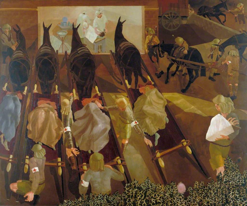 Spencer was commissioned to create this painting in April 1918 by the British War Memorials Committee. In his owns words Spencer wanted to show ‘God in the bare real things, in a limber wagon, in ravines, in fouling mule lines.’ Of those he depicts he said ‘during these nights the wounded passed through the dressing stations in a never ending stream.’ More on this painting
