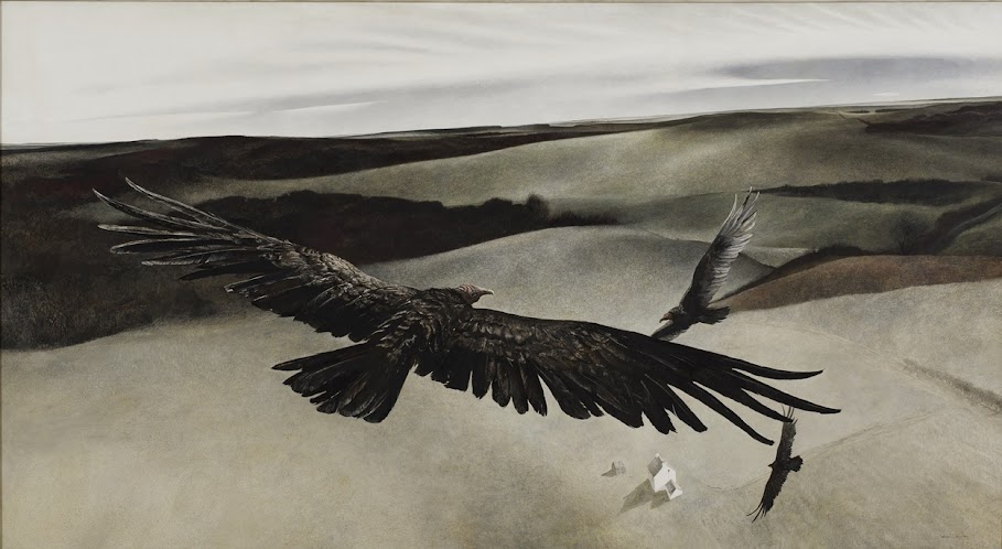 In Soaring, begun in 1942, Wyeth took to the sky to adopt a bird’s-eye view of his surrounding landscape. In this large-scale painting, the viewer hovers with three turkey vultures above a lone house and barn isolated in a vast, empty landscape. The largest vulture, suspended just below the posited viewer. It appears as a dark form outlined against the fallow winter fields below. The two other raptors that circle below, closing in on the farm, indicate the yawning distance between the viewer and the ground…