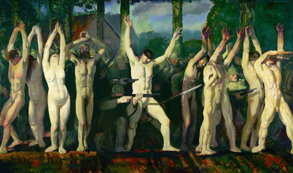 In 1918, moved by reports of atrocities committed against civilians during the First World War, Bellows departed from his typical subjects and painted five large-scale canvases to call attention to their plight. The Barricade derives from an incident during the invasion of Belgium in August 1914, when German soldiers used townspeople as a human shield. Bellows presented the victims as nudes, simultaneously underscoring their vulnerability and recalling depictions of martyred saints from the history of art. Because Bellows had not witnessed these events firsthand, the artist Joseph Pennell charged that he had no right to paint them. Bellows replied that he was not aware that Leonardo da Vinci had “had a ticket to paint the Last Supper.” More on this painting