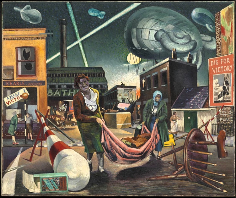 The determined face of the woman on the left, (possibly a portrait of the artist’s wife rescuing some of her possessions from the scene of the recent attack confronts the viewer whose attention is also drawn towards the dramatically foreshortened chair, empty cigarette packet and striped barrier. The sky, filled with barrage balloons to prevent bombing by the Luftwaffe, is lit up by two searchlights which make an aggressive pattern over a factory. The ‘Dig for Victory’ poster on the right hand side, which shows a man working a spade into the earth, refers to a Government campaign which encouraged people to cultivate their gardens and allotments due to the difficulty of importing foodstuffs. The graffiti immediately beneath it with the slogan, ‘Vote Joyce, Say Peace’, alludes to the British Nazi propagandist, William Joyce, who broadcast appeals to the British to surrender. The poster on a shop window which reads ‘Smile and say Victory’, hardly seems reassuring amid the general devastation. The conflicting sentiments draw attention to the tensions in British Society during the war. More on this painting