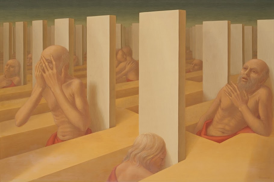 Having completed his English degree at Harvard, George Tooker, born New York City 1920-died Hartland, VT in 2011, went to New York in 1943 to study at the Art Students League, where he worked for two years with Reginald Marsh. Like his friends Jared French and Paul Cadmus, Tooker paints in egg tempera and borrows compositional arrangements from the Renaissance Italians, but his thematic ties are with the existential ideas of Jean-Paul Sartre and Samuel Beckett. Many of Tooker’s paintings contain a strong element of implicit social comment, and he creates silent theaters in which reality is transformed into deadeningly repetitive drama. He uses precise, geometric architectural structures as backdrops for his protagonists, who often appear as shrouded, shapeless masses contained within boxes or cubicles. Human isolation, self-alienation, and spiritually void rituals are recurring themes in his work.