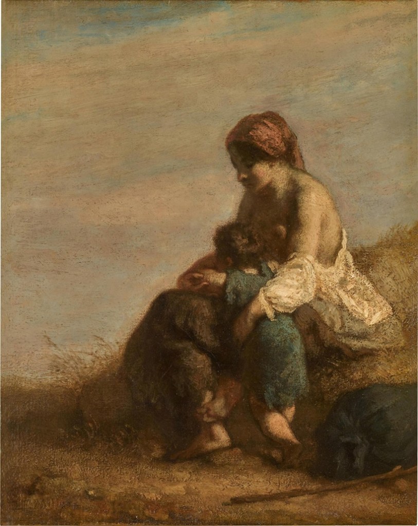 Here the young mother comforts her child, but she herself does not appear in distress. On the contrary, her expression is one of stoic calm and graceful beauty, typical of Millet’s depictions of peasants, whom he elevates to a higher, untouchable level. The ambiguities of The Wanderers between the Biblical and the modern are an indication of shifting art patronage. More on this painting