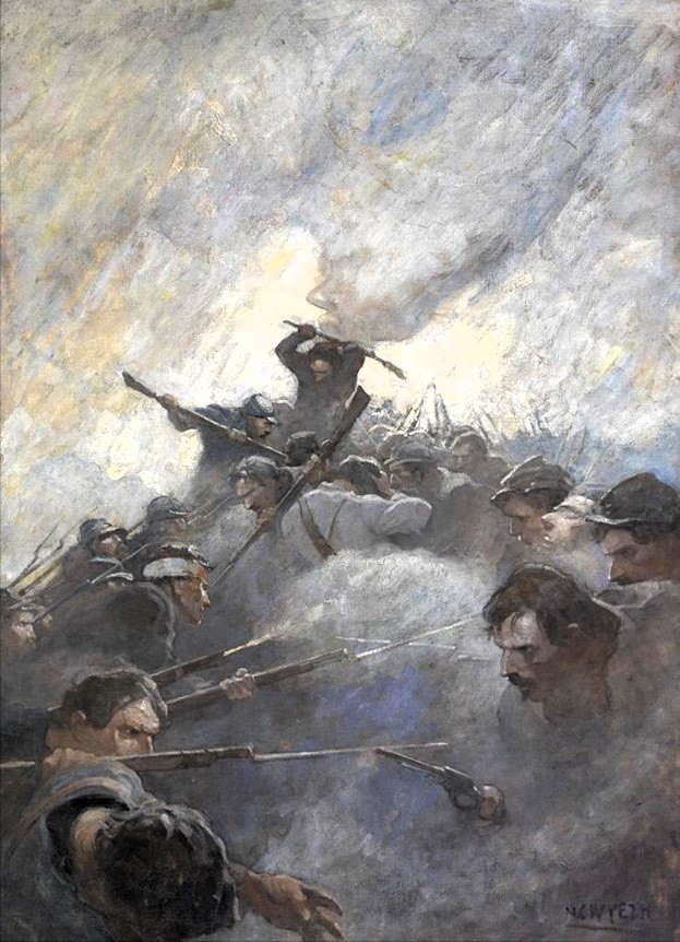 Wyeth compressed both blue and gray soldiers into the lower two thirds of the picture, with the figures in the chaos of battle rising to a compositional angle symbolizing an horrific apex in the history of the war and of the country. He admitted to Mary Johnston that the composition was also constructed with Houghton Mifflin’s advertising department in mind, feeling it would make an effective design for an advertising poster. More on this painting