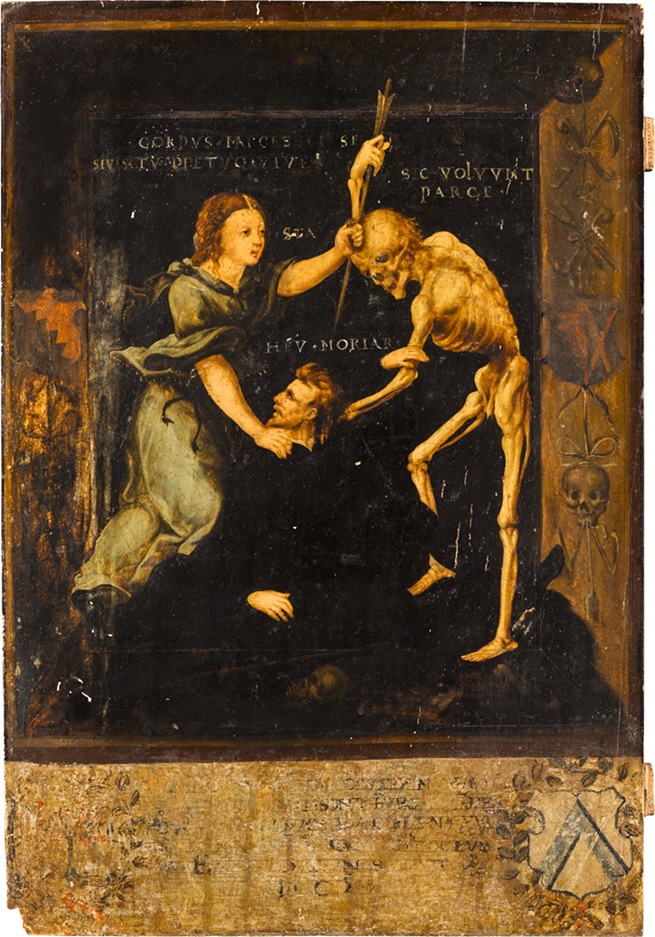 This thick panel undoubtedly corresponds to a votive work bearing the arms of the von Metzsch family, Germany (their coats of arms depicted in the lower right corner). The central scene, representing death and a young woman fighting for the survival of the man in the center, is reminiscent in its style of the painting of Jan Gossaert, known as Mabuse (1478-1532), which allows without doubt doubt to date the work around the middle of the 16th century. More on An Allegory of Death