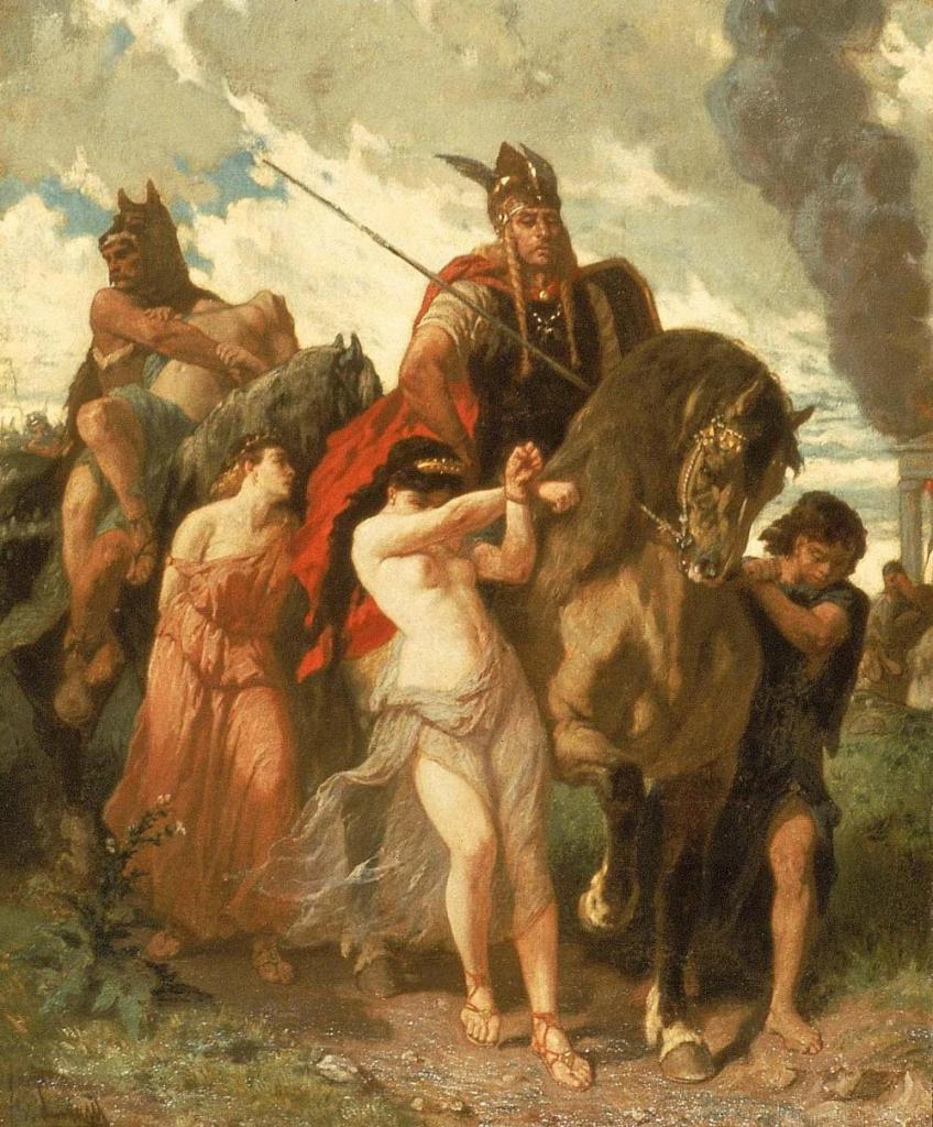 In a dramatic scenery, where the sky is darkened by the smoke of a burning and pillaged temple, two Gaul horsemen grab their bounty: young Greek or Roman women, who will become their slaves. Evariste Luminais shows here the full extent of his talent in the historical genre. Passionate about archeology, he is also obsessed with meticulousness and accuracy. He belongs to those French artists of the IIIrd Republic whose esthetic was inspired by subjects from French national history. Exhibited in the 1872 Salon under the title “Invasion”, this work was immediately perceived as an allegory of the French defeat of 1870. “The allusion is transparent, even though the scene is set in another time”, wrote the critic for Le Journal Amusant, before adding this was a “major canvas”. More on this painting