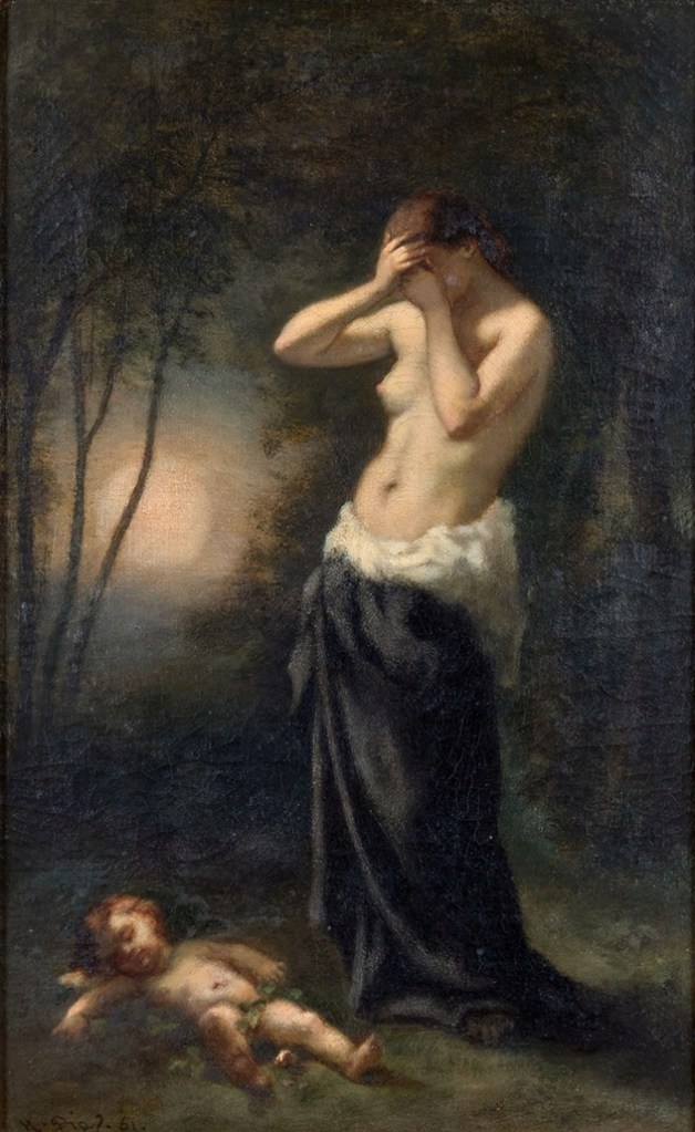 “The night has come; the moon rises full and bright on the horizon; its light penetrates the middle of the woods and illuminates with its reflections an entire scene. A young woman, her body only half covered with draperies, veils her face with both hands and cries when she sees Love sleeping among the flowers at her feet. (Extract from the Baron Michel de Trétaigne Collection sale catalog) More on this painting