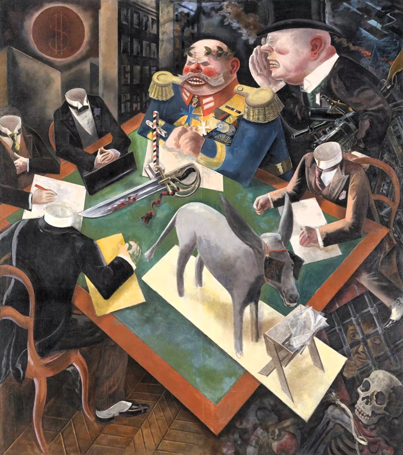 Grosz depicts mindless bureaucrats in a grim setting surrounding the decorated general Paul von Hindenburg, who was Field Marshall during World War I, served as second president of the Weimar Republic, and later named Adolf Hitler chancellor in 1933. An industrialist carrying weapons whispers in Hindenburg’s ear. A donkey representing the German people stands near a bloody sword and listens with big ears, yet wears blinders of ignorance. Confined and stepped on, the fearful face of a youth juxtaposed with a skeleton warns of the fate of future generations. More on this painting