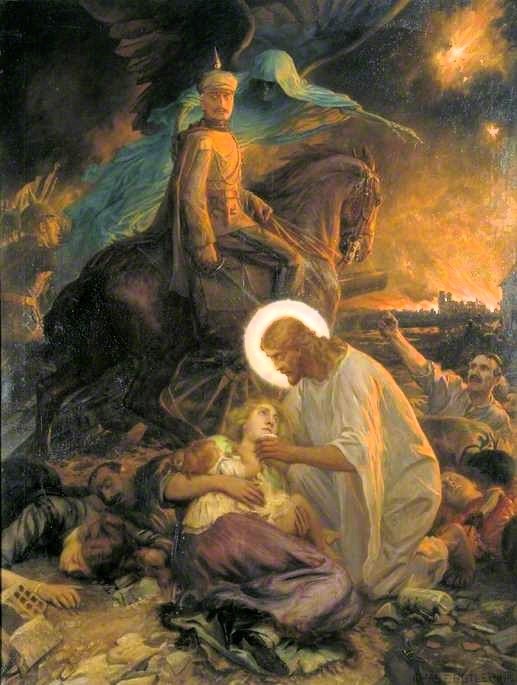 In the foreground Christ nurses a dying woman who holds a child. Above them is Kaiser Wilhelm seated on horseback with the Angel of Death at his shoulder. There are German troops behing him. The Kaiser has a haunted but defiant expression, immune to the chaos around him. Bodies litter the ground and a dying man raises his fist to the Kaiser. Fires rage in a Belgian town, presumably Louvain, a church burns and a flare lights the sky.