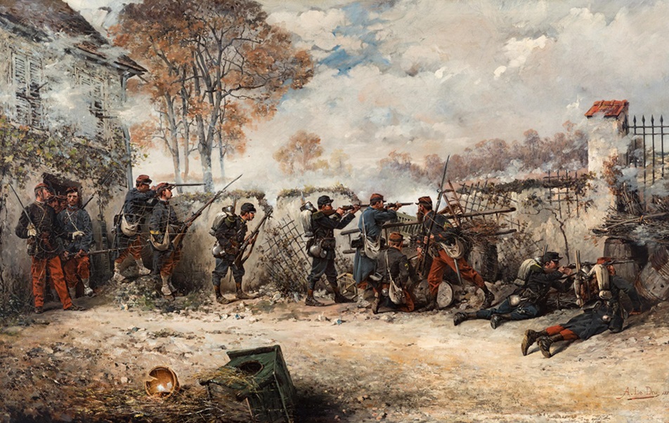 In this military scene, a group of soldiers of the French army take cover behind a whitewashed wall. They point their rifles towards the battlefield, taking shelter in the courtyard of an abandoned house. Through the splintered timbers of the windows, several rifles are also sticking out, and the smoke rises into the overcast sky. More on this painting