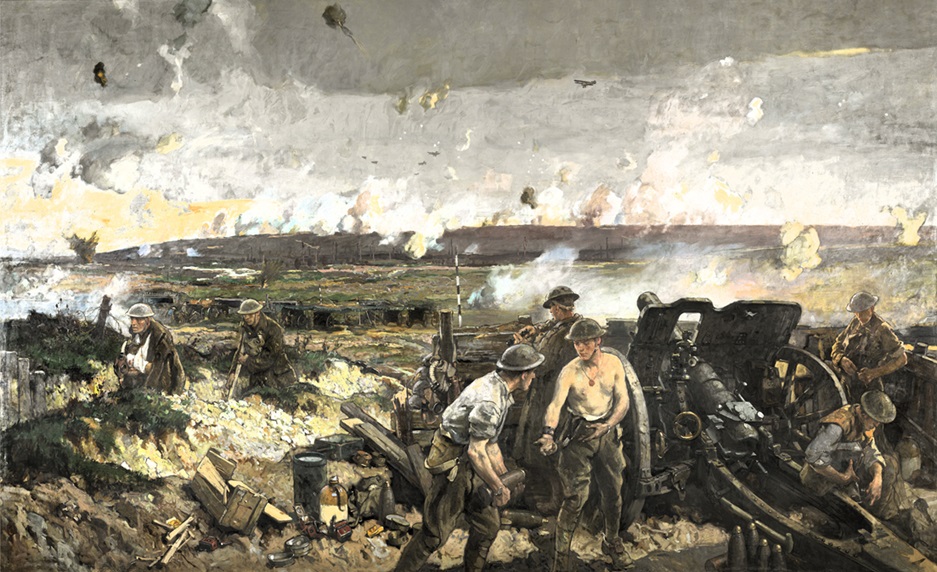 Richard Jack was the first Canadian official war artist, appointed in 1916. In this painting, he depicts the crew of an 18-pounder field gun firing at German positions on Vimy Ridge. To the left, wounded soldiers move past the gun towards the rear.