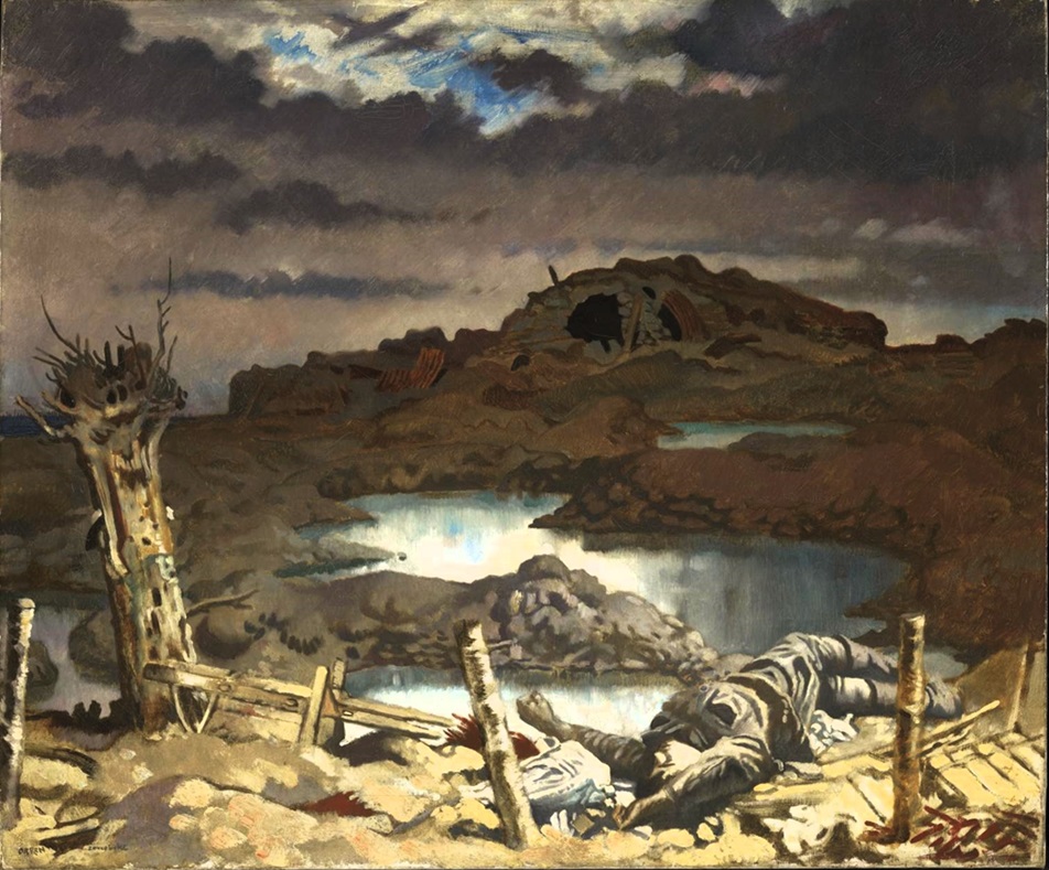 In the spring and summer of 1917 Orpen painted the battlefields of the Somme, sometimes at places that had been captured only a short time earlier. Orpen described in a letter the shocking experience of seeing numbers of corpses lying unburied among the flooded shell holes, in a landscape totally empty of life. In his pictures of the blasted battlefields, and in his portraits of the exhausted or shell-shocked men, Orpen got physically and emotionally closer to the full horrors of the First World War than most of the other official artists. More on this painting
