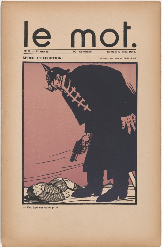 Le Mot, a wartime French literary and artistic journal published by Jean Cocteau and Paul Iribe, was characterized by a restrained modernism and a fiercely nationalistic, anti-German perspective. This cover shows a German officer with a smoking gun, his face distorted as he screams at and hovers over the body of a young boy he has killed. Subtitled “an era without pity,” the work refers to heinous acts committed by the German army as they invaded Belgium—a neutral country—and northern France in August 1914. Reports of the brutal treatment of noncombatants (such as mass executions that included women, small children, and the elderly) and damage to towns and cultural centers shocked the public, leading to a characterization, particularly within France, of the German soldiers as destructive and uncivilized “huns” particularly within wartime propaganda. More on this work