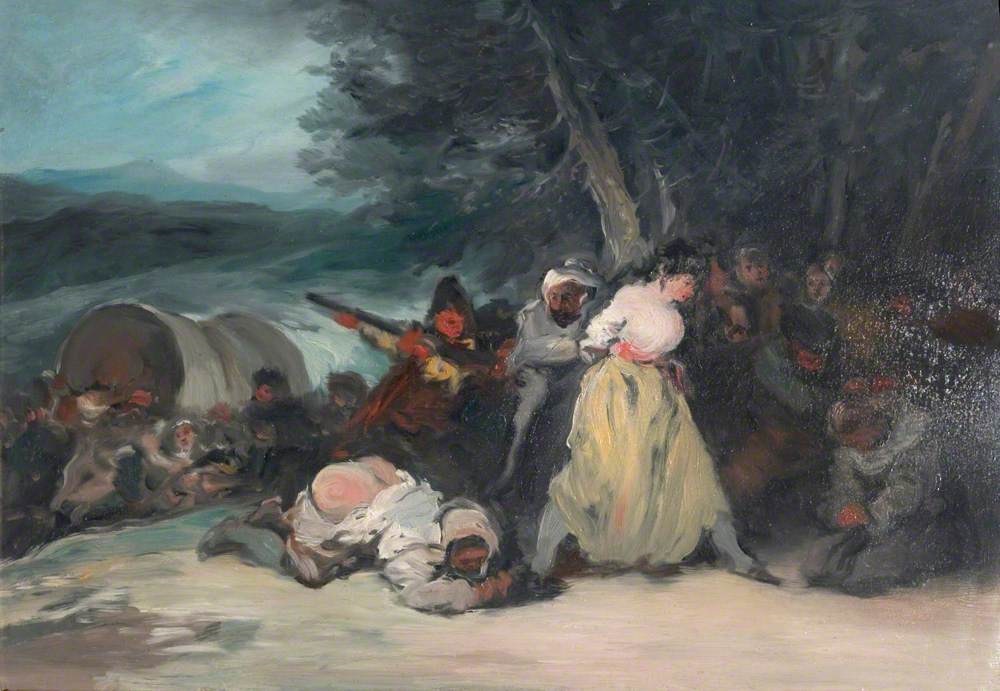 The theme of travellers waylaid by bandits was a common one in the eighteenth and early nineteenth century painting as the Napoleonic wars brought chaos and lawlessness to many parts of Europe. Criminals, deserters and the remnants of defeated armies often turned to highway robbery as the social order collapsed. More on this painting