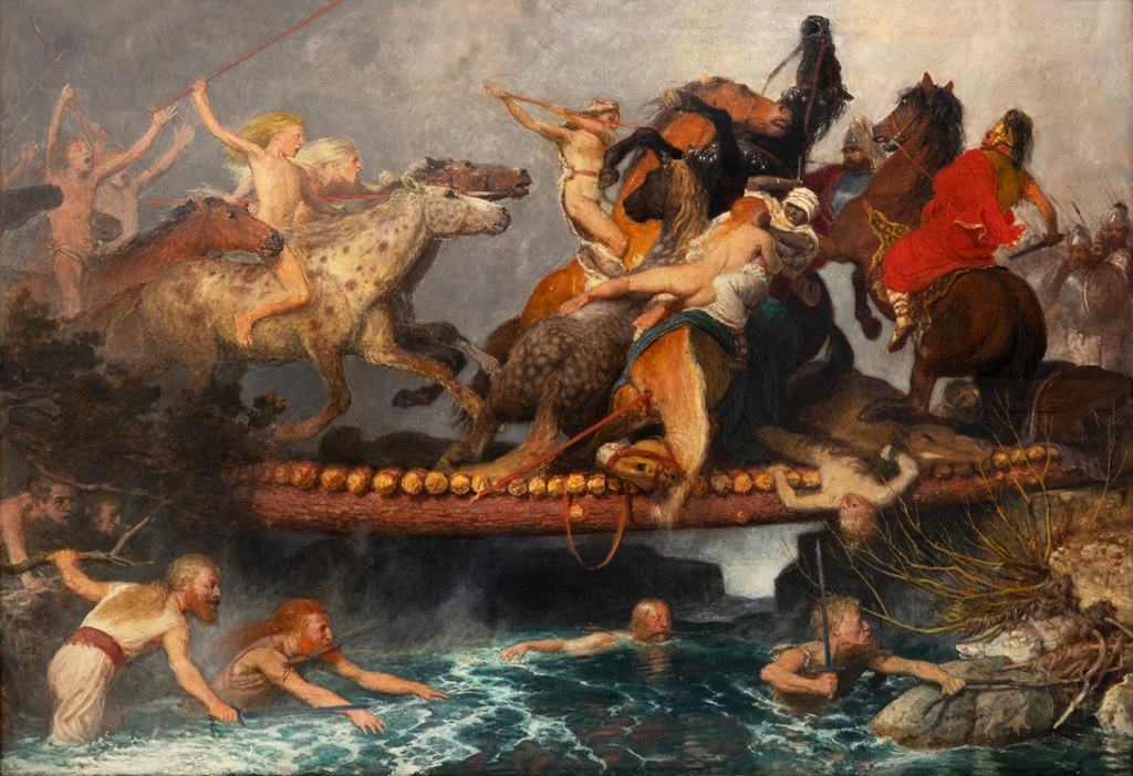 The battle on the bridge between the Roman army and the advancing Germanic tribes reflects a broader fascination during the nineteenth century for the fall of the Roman Empire. Böcklin’s choice of subject was no doubt also influenced by philosophies current at the time, notably Nietzsche’s notion of the ‘blond beast’ expounded in his polemic, Zur Genealogie der Moral (On the Genealogy of Morals), published in 1887. More on this painting