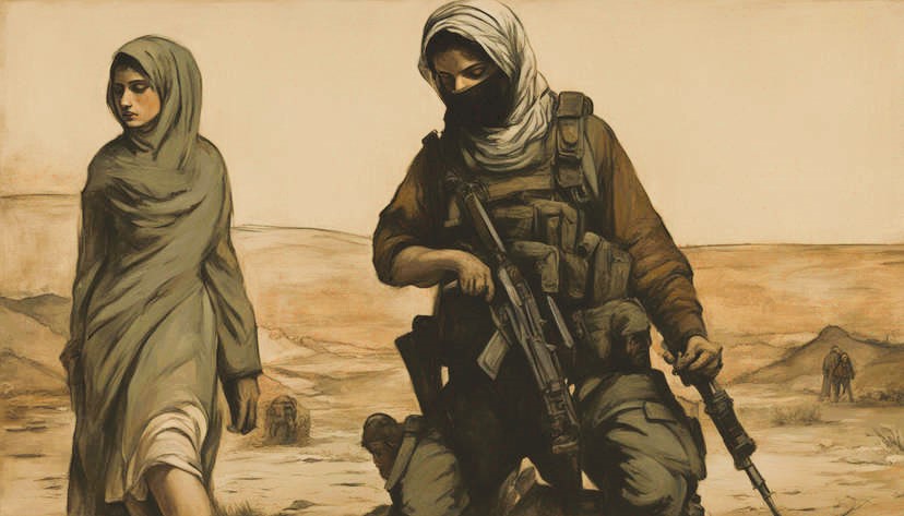 The scene unfolds with a striking composition, highlighting the contrasting emotions of the Hamas soldier and Gazan woman…