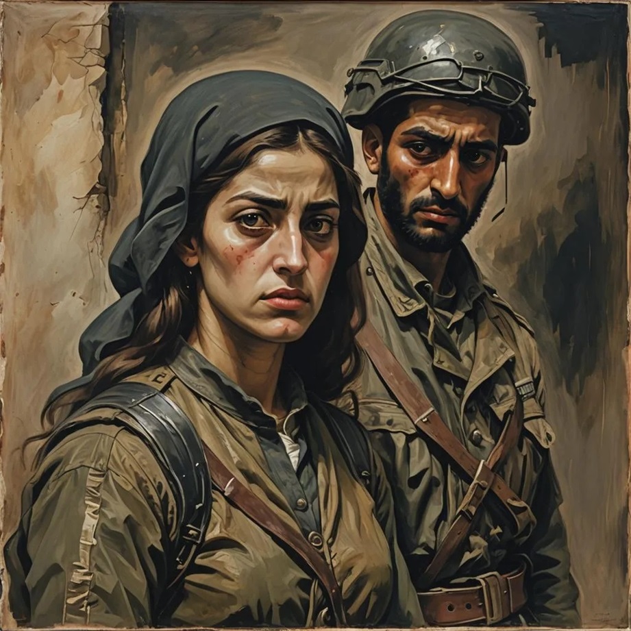 At the center of this tableau, stands the Hamas soldiers, their figures robust and towering, emanating an aura of rugged strength. Cloaked in their military uniform, symbolizing determination amidst bloodshed. Their hardened faces bear the marks of countless trials and tribulations. Sunken eyes, shaded with the weariness of war, fixate upon the viewer, searching for understanding or perhaps just a hint of empathy.