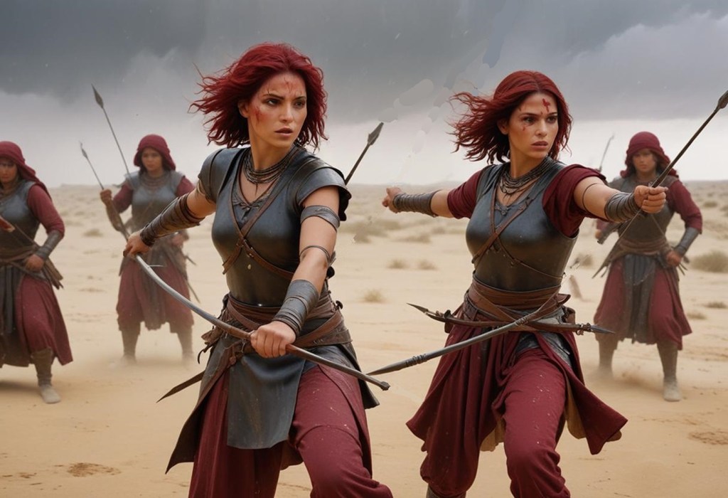The composition is dynamically balanced, with the sisters positioned at the forefront, their bodies twisted in mid-action as they skillfully draw back their bows, ready to release a volley of deadly arrows towards the enemy. Their expressions, a mix of determination and fierce resolve, further emphasize their status as warriors reaping havoc upon their foes.