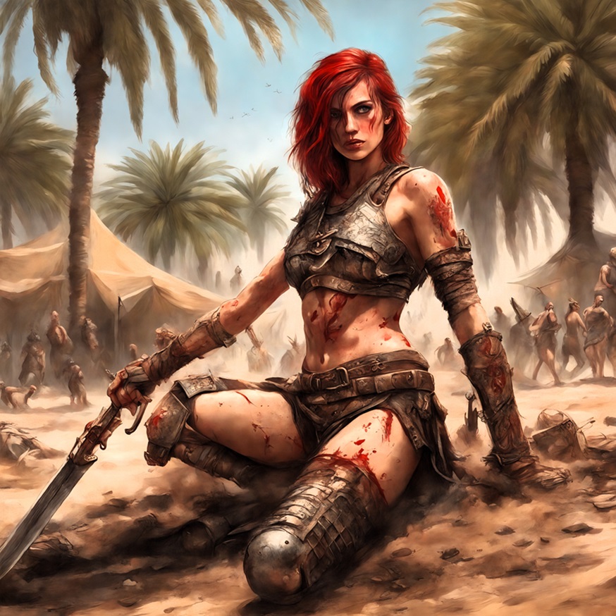As Alma lay there, her thoughts drifted back to the events that had unfolded. She had been leading her tribe, defending their land from invaders who sought to claim their resources. The battle had raged on for days, leaving casualties scattered across the sandy terrain. With every swing of her scimitar, she had fought valiantly to protect her people.