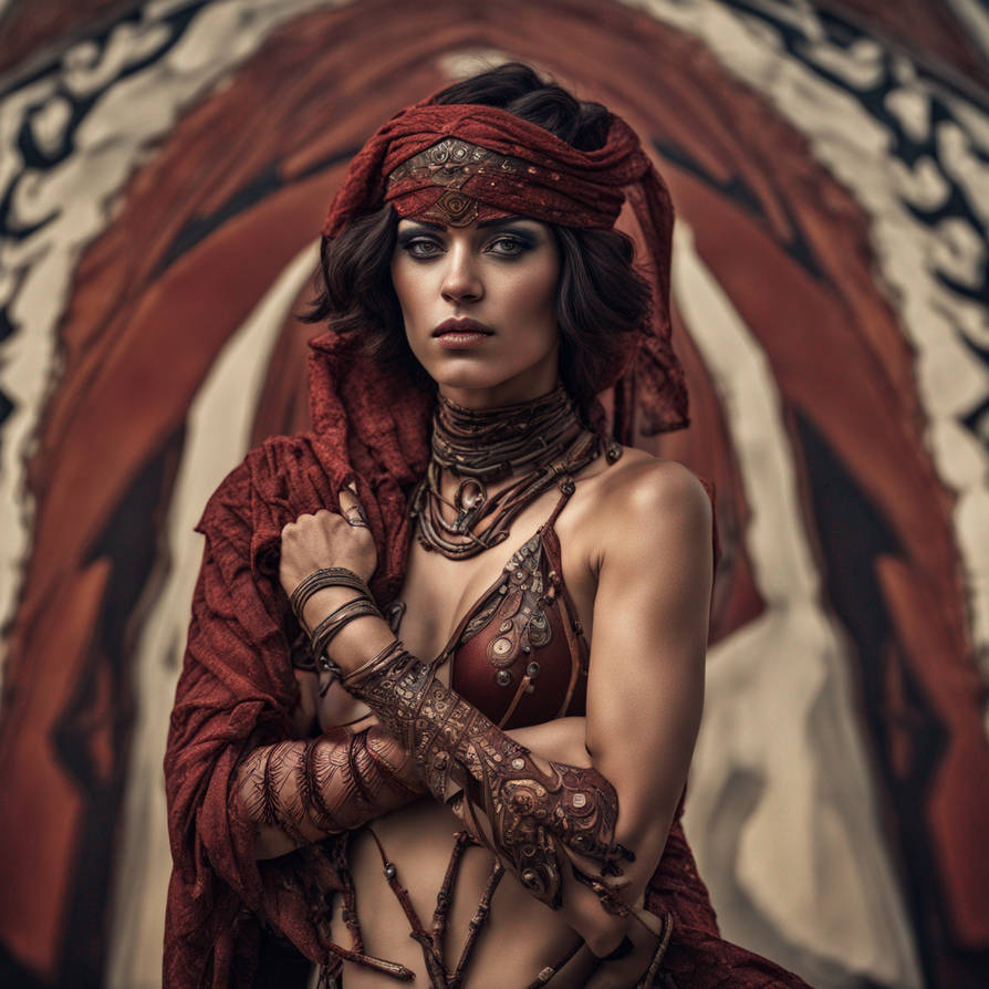 Collage body paintings. dark red haired Bedouin warrior woman, piercing eyes, sensual poses, sampling her new armor with complex flowing arabesque shapes, subtle shadows, body armor colors…