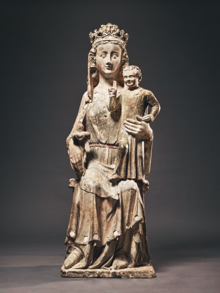 While many of the Virgin and Child groups produced in France in the Gothic period possess more familial and tender poses, the front-facing and slightly formal postures of the figures in this group, and especially of the Christ Child, who stands in his mother’s lap, evoke the sedes sapientiae, or Throne of Wisdom, a representation of the Virgin and Child typical of the Romanesque period. More on this Sculpture