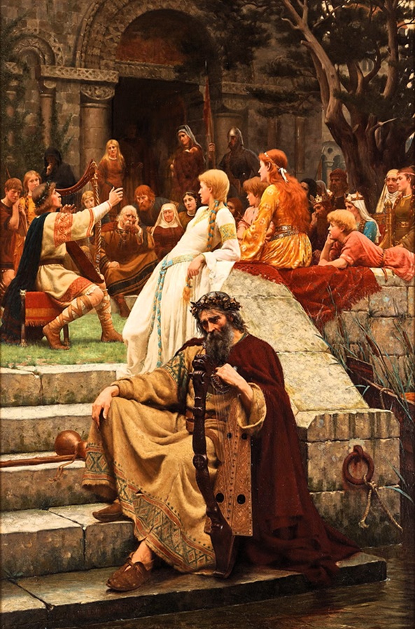 Blair Leighton depicts an aged harpist whose fame has waned and is overshadowed by a younger colleague. The elderly man is shown sitting on the steps in the foreground of the image, and behind him the crowd is gathered outside the church gate to listen to the younger musician. Even the King and Queen attend the concert. It was once claimed that Blair Leighton depicted his contemporaries in a historical context. He often chose motifs and themes that his contemporary audience could recognise, such as love, fear and grief. In ‘Faded laurels’ he deals with the eternal theme of the rise and fall of fame. More on this painting