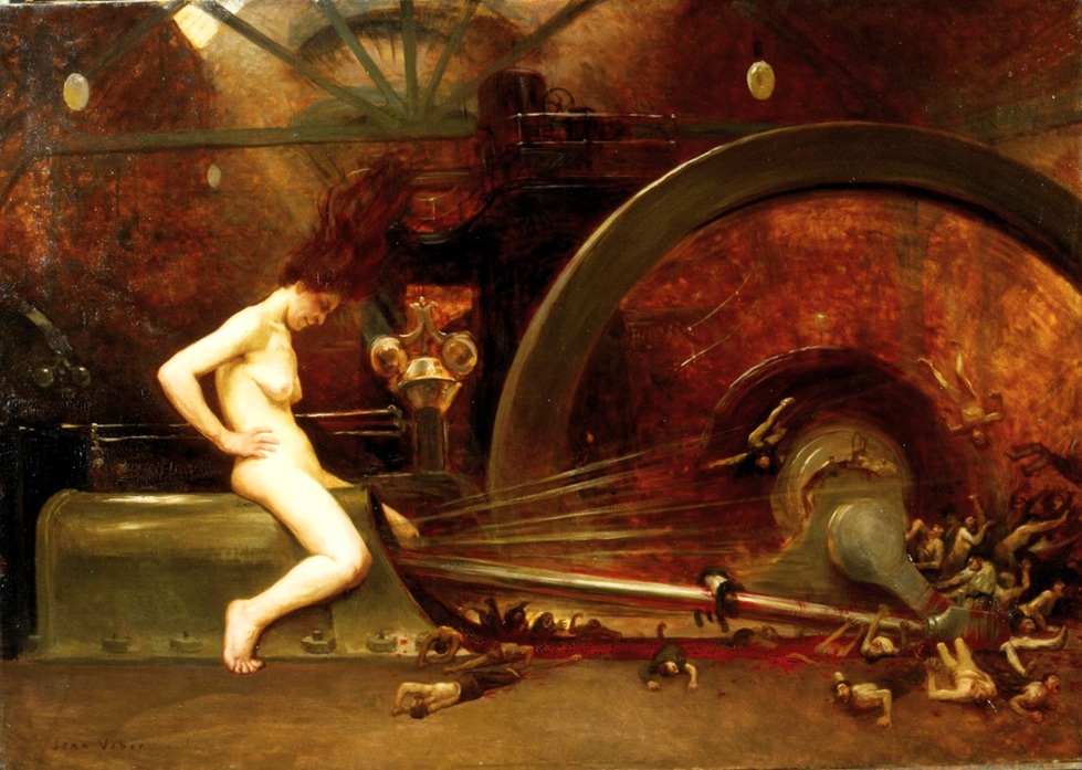 Dynamis is one of Veber’s most striking works: Industry, embodied by a demonic woman, takes visible pleasure in crushing the workers who serve her…