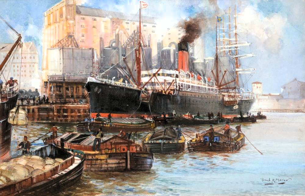 Frank Henry Mason (1 October 1875 – 24 February 1965), RBA, RI, RSMA was an artist best known for his maritime, shipping, coastal and harbour paintings, and as a creator of art deco travel and railway posters. His style is described as ‘light impressionist’ and he was a founder member of the Staithes Art Club whose members are known today as the Staithes group of artists, or the Northern Impressionists. More on Frank Henry Mason
